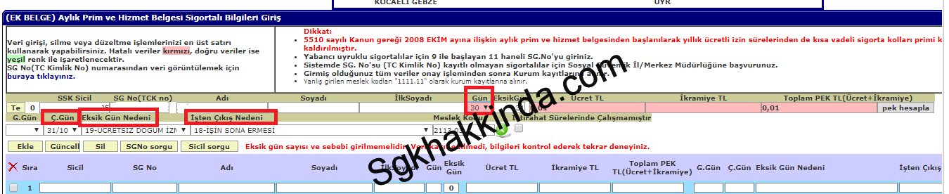 Bu ekranda en üstte SG No ( TCK no ) bölümüne ilgili işçinin T.C. kimlik numarasını ve sonrasında adını ve Soy adını yazdıktan sonra,